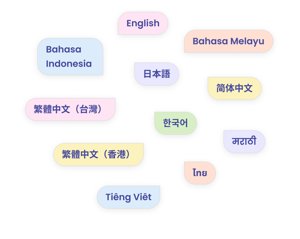 English, Mandarin, Japanese, Korean, Bahasa Melayu, Bahasa Indonesia, Thai, Vietnamese, Marathi (India).